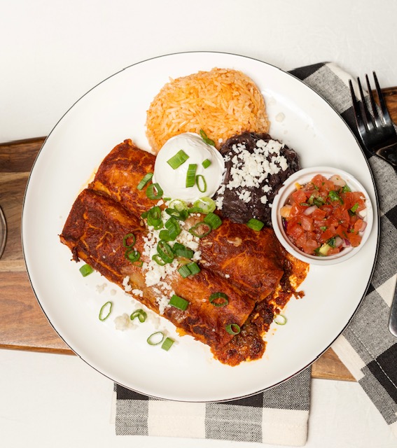 USDA Beef served with mexican rice, black beans and pico de gallo.