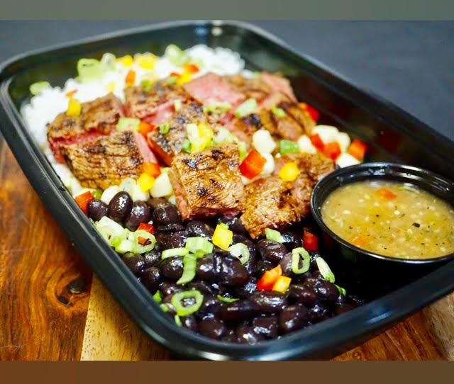Tender & delicious USDA steak served with jasmine rice, corn pico, black beans and roasted tomatillo salsa.