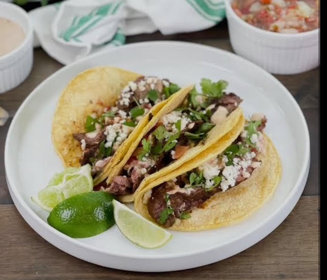 Tender & delicious lime USDA steak served with corn tortillas, pinto beans and roasted tomatillo salsa.