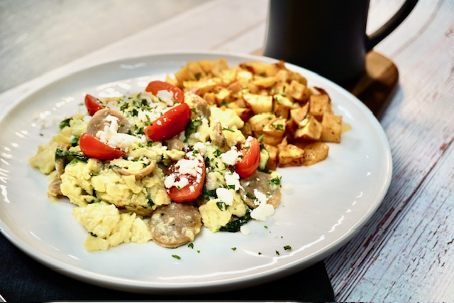 Cage-Free eggs, feta cheese, and spinach served with hash browns.