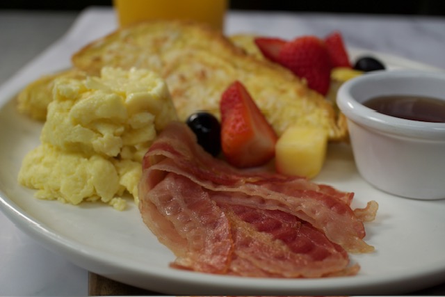 Cage-Free Scrambled Eggs served with pork bacon, tropical fruit, and sugar free syrup.