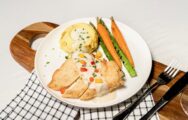 Organic Free range chicken Breast served with garlic mash potato, lemon caper sauce, and grilled asparagus.