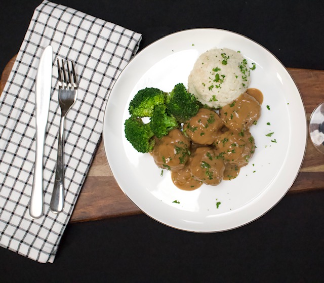 Grass-Fed Ground Beef served with garlic cauliflower mash, creamy brown gravy, and seasonal vegetables.